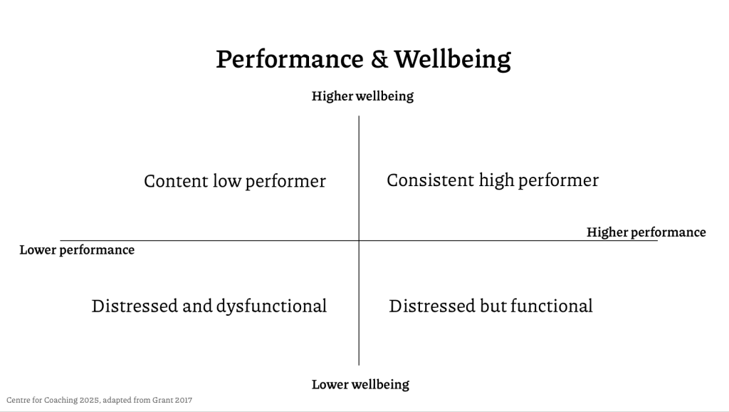 - Content low performer: coping but underperforming, perhaps avoiding change or putting things off, while wellbeing feels steady